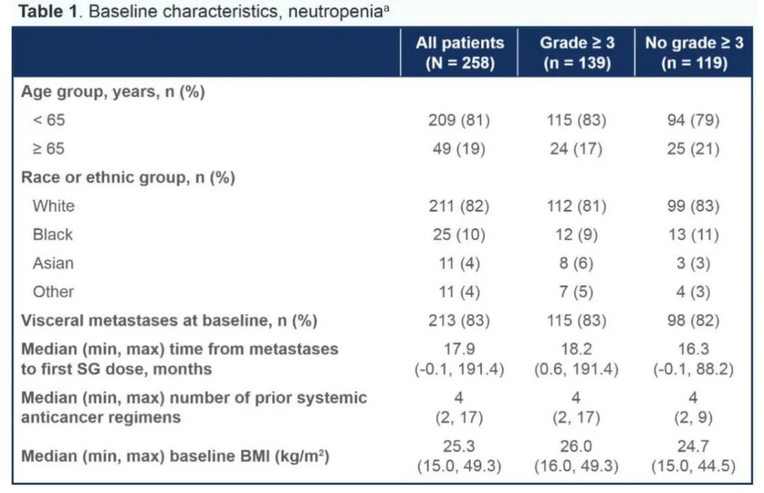对于本分析中接受SG治疗的受试者,≥3级中性粒细胞减少的发生率为54%(n=139),≥2级腹泻的发生率为32%(n=81)。出现中性粒细胞减少或腹泻的受试者基线特征大致相似(表1和表2);发生≥2级腹泻的患者身体质量指数(BMI)最高。只有1例因腹泻(非严重2级事件)而停药,并被评估为与研究药物无关,且已解决。没有5级中性粒细胞减少或腹泻的发生。