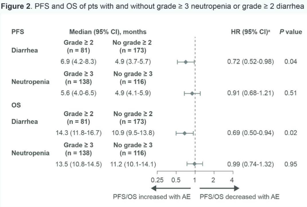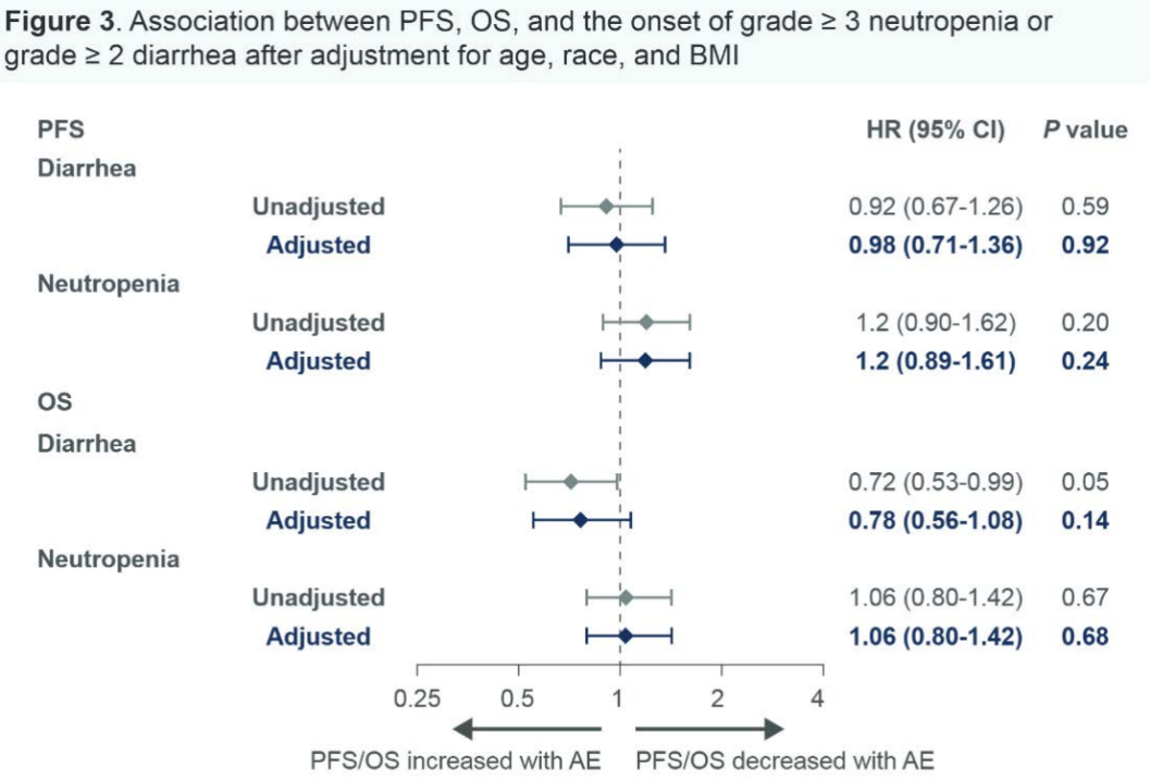 事后分析显示,发生≥2级腹泻的患者,与未发生上述AE的患者相比,PFS和OS均有改善,且上述结果在两组意向性治疗(ITT)人群中一致(图2)。延长治疗时间导致累积不良事件风险增加可能会混淆这些结果。在对年龄、种族和BMI进行校正后,在随时间变化的Cox模型中未观察到PFS和OS的差异(图3)。发生或未发生≥3级中性粒细胞减少的患者,具有相似的PFS和OS(图2和图3)。