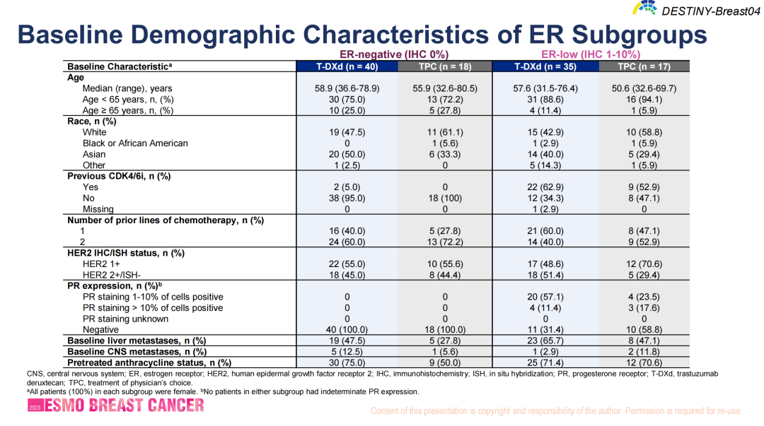 宋传贵教授:大家对DB-04研究ITT人群的数据分析已经非常熟悉了,这项研究使乳腺癌抗HER2治疗进入三元化时代,具有里程碑意义。这次ESMO BC大会进一步报道了ER零表达和低表达患者的数据[7]。研究中分别有58例ER IHC 0%和52例ER IHC 1%~10%的患者。从ER 1%~10%人群的T-DXd和TPC两组患者的基线特征来看,T-DXd组患者既往CDK4/6i的治疗比例(62.9%vs 52.9%)、肝转移比例(65.7%vs 47.1%)均更高。