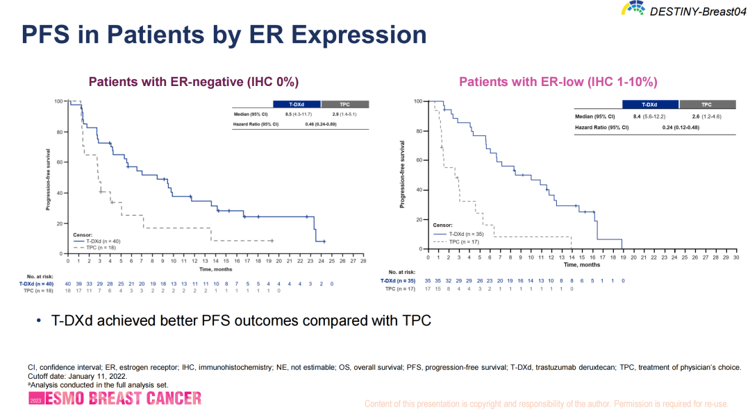 在ER 0%患者中,T-DXd组和TPC组患者的无进展生存期(PFS)分别为8.5个月和2.9个月(HR 0.46,95%CI:0.24~0.89),总生存期分别为18.2个月和8.3个月(HR 0.48,95%CI:0.24~0.95),客观缓解率(ORR)分别为50%和16.7%。
