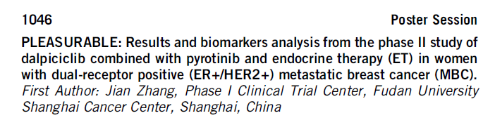 编者按:美国临床肿瘤学会(ASCO)第59届年会如约而至。本届大会上,复旦大学附属肿瘤医院胡夕春和张剑教授团队开展的达尔西利联合吡咯替尼和内分泌治疗双受体阳性(ER+/HER2+)转移性乳腺癌的Ⅱ期研究(PLEASURABLE)结果和生物标志物分析入选大会poster,肿瘤瞭望特邀摘要第一作者复旦大学附属肿瘤医院张剑教授为我们进行介绍。