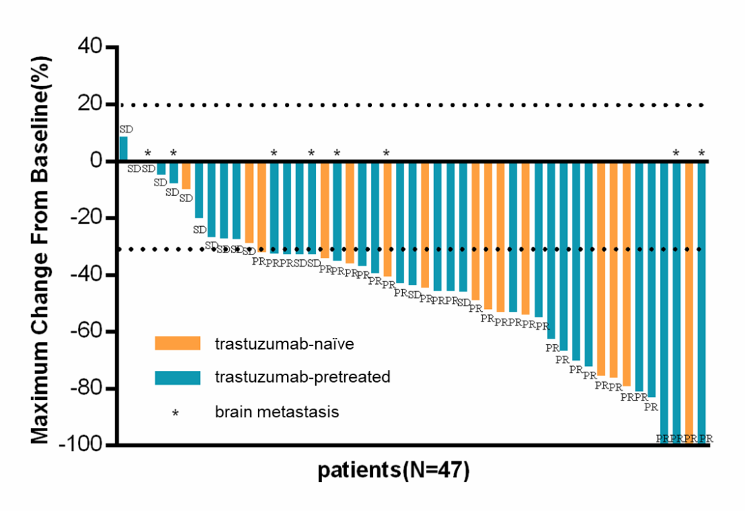 疗效:整体人群中,客观缓解率为68.1%(32/47),疾病控制率为100%(47/47)。曲妥初治和曲妥经治受试者的ORR分别为81.3%(13/16)和61.3%(19/31)。中位无进展生存期和总生存期数据尚未成熟。