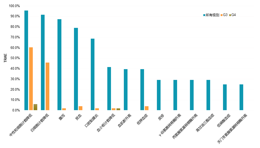 安全性:研究中未观察到新的安全性信号。最常见的治疗相关不良事件是中性粒细胞计数降低(95.8%),白细胞计数降低(91.7%),腹泻(87.5%)、贫血(79.2%)、口腔黏膜炎(68.8%)和血小板计数下降(41.7%)。