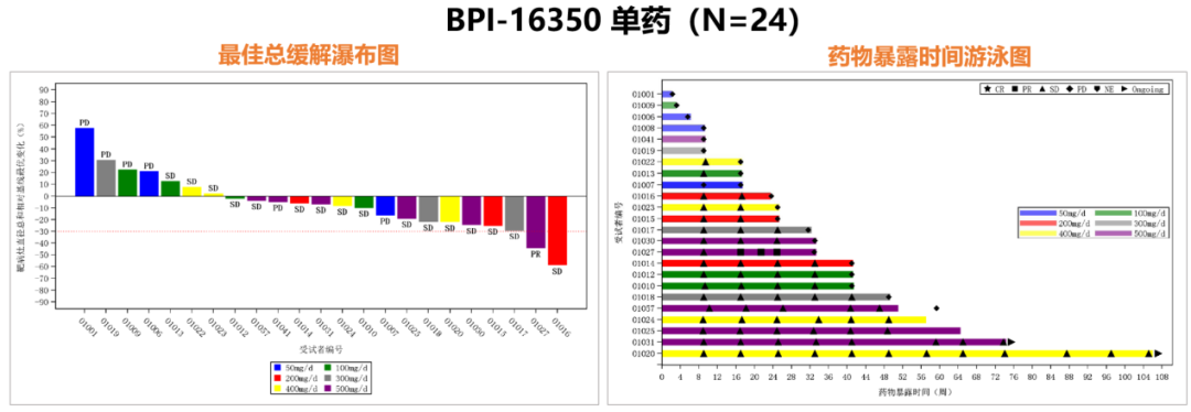 研究结果:截至2022年11月13日,在A阶段,共入组24例患者(50 mg,4例;100 mg,4例;200 mg,3例;300 mg,3例;400 mg,4例;500 mg,6例)包括23例晚期乳腺癌患者和1例腹部脂肪肉瘤患者。66.7%(16/24)的患者接受过≥2线化疗,70.8%(17/24)患者接受过≥2线内分泌治疗。仅在500 mg剂量组观察到1例3级血肌酐升高DLT事件,MTD未达到。45.8%(11/24)的患者发生≥3级不良事件,最常见的为腹泻(4/24)、贫血(3/24)和中性粒细胞减少(2/24)。BPI-16350的中位达峰时间为2.0~17.0小时,平均半衰期为35.6~51.0小时,支持每日1次给药。单次口服50~500 mg BPI-16350后,药物的暴露量与剂量成正比。QD连续给药后,蓄积比为2.1~3.3倍。疾病控制率(DCR)为70.8%(17/24,95%CI:48.9%~87.4%)。500 mg剂量组1例(4.2%)患者达到部分缓解(PR)。