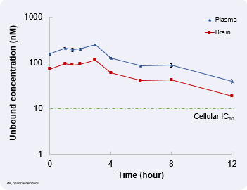ZN-1041的PK暴露随着剂量的增加而增加,1例患者的Kpuu,CSF达到4.9。800mg bid多次给药后,非结合药物浓度在人脑中持续覆盖IC90,血浆中的IC90约为2倍(图3;脑部数据由临床前研究的Kpuu,brain 0.47预测所得)。