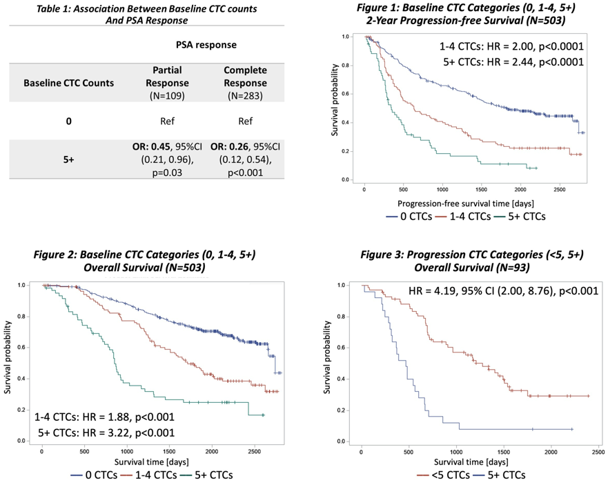 SWOG S1216是一项雄激素剥夺疗法(ADT)联合cyp17抑制剂orteronel对比ADT联合比卡鲁胺用于转移性激素敏感性前列腺癌(mHSPC)治疗的Ⅲ期临床试验。2020年ASCO曾报道基线CTC计数是PSA缓解和疾病进展的预后指标。这次进一步报道了基线CTC计数与PSA缓解、无进展生存期(PFS)和总生存期(OS)的相关性。