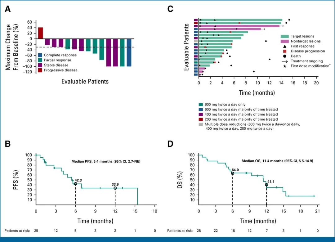 所有出现颅内反应的患者在研究期间也进行了剂量调整;4名应答者在第二次进行扫描检查时首次发现治疗应答。全身ORR为30%,中位DOR为5.6个月,中位PFS为5.3个月。可根据mRANO-BM标准评估颅内治疗活性的患者(n=20)中,经确认的颅内ORR为35%,颅内DCR为85%。