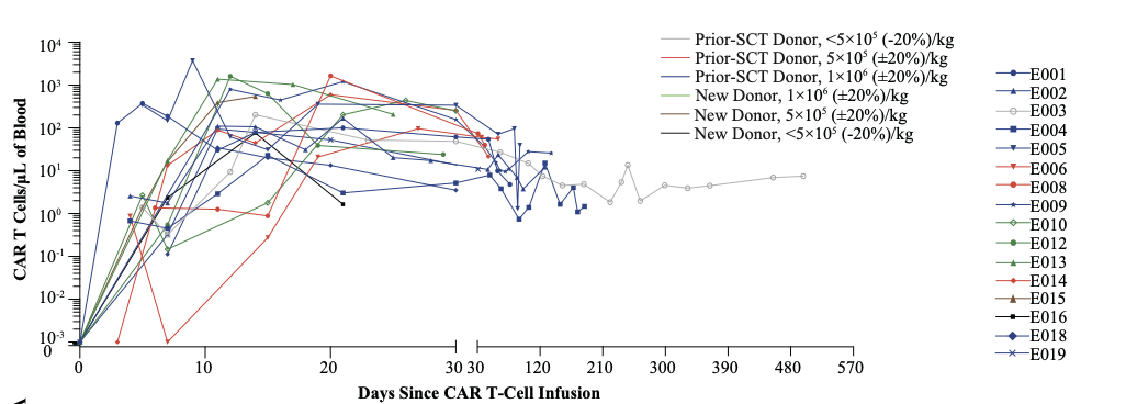 截止2023年5月12日,在安全性方面,30天内发生的不良事件(AEs)包括:①在血液系统AEs方面,所有患者均有3~4级白细胞和中性粒细胞减少症,13例(81%)和12例(75%)出现血小板减少和贫血。②12例(75%)患者有1~2级细胞因子释放综合征(CRS),4例(25%)患者出现1~2级免疫效应细胞相关神经毒性综合症(ICANS),11例(68%)患者有1~2级皮肤移植物抗宿主病(GVHD)。