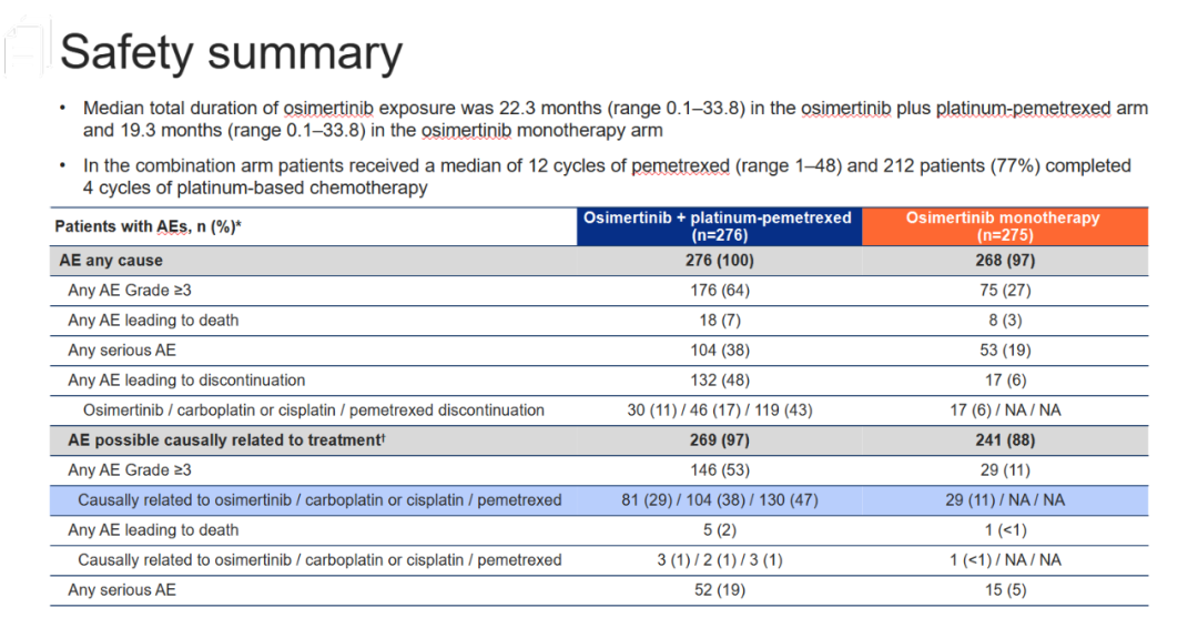 安全性分析显示,联合疗法总体耐受性良好,不良事件可控。本试验中观察到的不良反应(AE)是通常与奥希替尼和化疗相关的不良反应,例如血液学毒性,并且没有观察到新的AE。此外,Jänne说,与奥希替尼单药治疗相关的间质性肺疾病的发病率和严重程度并没有随着加入化疗而增加。