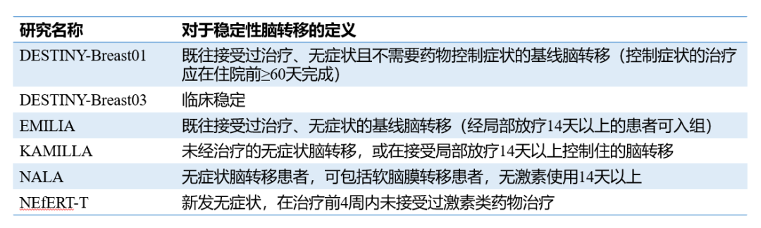 目前仍尚无针对有效控制颅内疾病的标准系统治疗方法,针对这一未被满足的临床需求近些年关注度有所增加,较多HER2+脑转移临床试验评估了颅内疗效终点。然而,在这些临床试验设计中观察到了较大的异质性。大多数临床试验(LCCC1025、NCT01004172、NCT02260531、PATRICIA、TUXEDO-1、EGF105084、LANTERN、PERMEATE、TBCRC 022、NCT02308020、LANDSCAPE)纳入了活动性脑转移的患者;而只有两项试验招募了同时具有活动性和稳定性脑转移的患者(HER2CLIMB和DEBRAH);六项试验仅纳入了稳定性脑转移的患者(NEfERT-T,EMILIA,DESTINY-Breast01,DESTINY-Breast03,KAMILLA,NALA),在这六项试验中,仅在DESTINY-Breast01、NEfERT-T、EMILIA、NALA在研究开始前定义了疾病稳定的时间,但具体定义仍存在一定差异,具体请见下方表格。在这些研究中均关注了颅内疗效终点,包括颅内客观缓解率、颅内PFS及中枢神经系统转移进展时间。