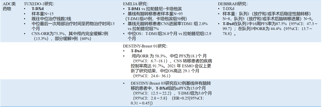 下表列出了抗HER2系统治疗药物针对HER2+脑转移的主要临床试验数据[2]