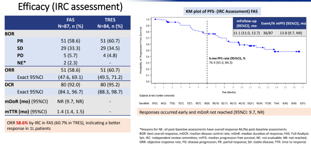 独立审查委员会(IRC)评估的客观缓解率(ORR)、疾病控制率(DCR)分别为58.6%与92.0%,中位至缓解时间(TTR)为1.4个月,中位无进展生存(PFS)为13.8个月,6个月PFS率分别为76.4%,中位缓解持续时间(DoR)与总生存(OS)尚未达到。研究者(INV)评估的患者ORR为59.8%,DCR为92.0%,中位TTR与DoR分别为1.4个月与12.5个月。患者的中位PFS达11.0个月,6个月PFS率为71.8%。