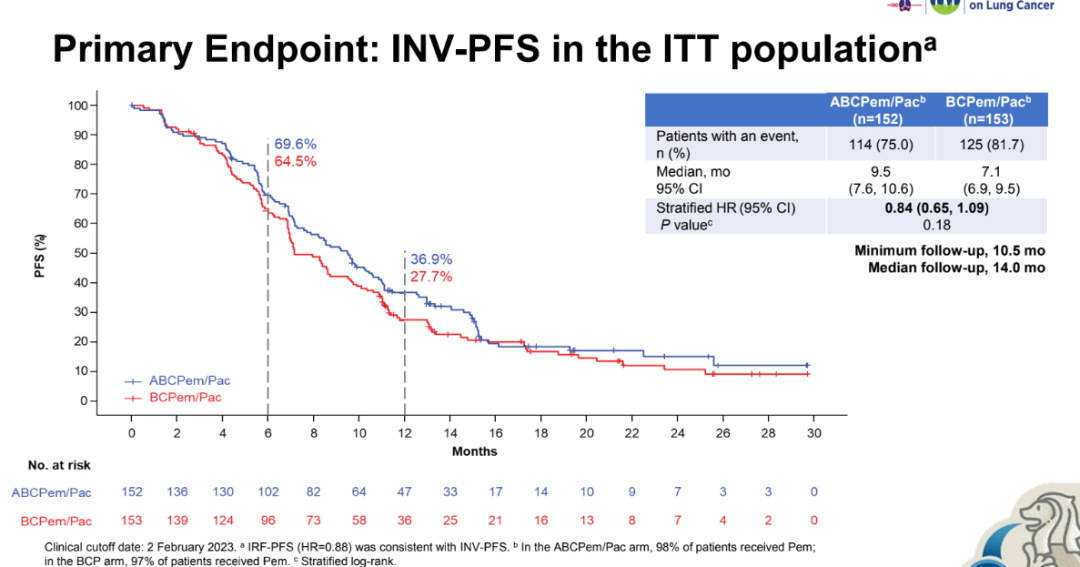 ITT人群中,ABCP vs. BCP的中位INV-PFS分别为9.5个月和7.1个月(HR=0.84,95%CI:0.65-1.09,P=0.18),两组的差异未达到统计学显著性。