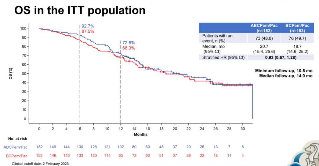 在ITT人群中,两组的OS相似,中位OS分别为20.7和18.7个月(HR=0.93,95%CI:0.67-1.28)。