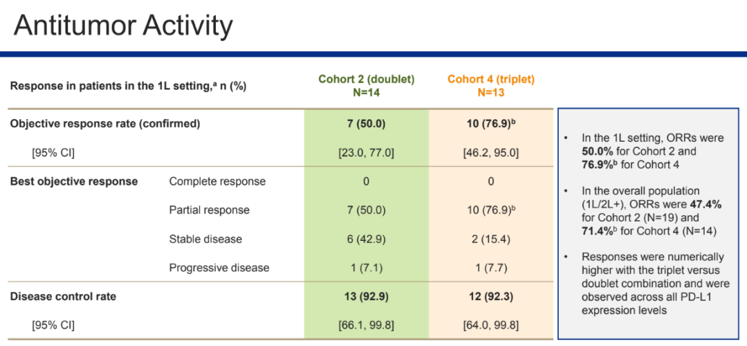 2023年WCLC会议公布了TROPION-Lung04中期分析结果(队列1-4),患者接受Dato-DXd(4 mg/kg,队列1/3;6 mg/kg,队列2/4)+度伐利尤单抗(1120 mg,所有队列)+4个周期卡铂(AUC 5,队列3/4)治疗。疗效方面,队列2中,一线治疗患者(n=14)的ORR为50.0%,DCR为92.9%;队列4中,一线治疗患者(n=13)的ORR为76.9%,DCR为92.3%。此外,在不同的PD-L1表达水平患者中均观察到缓解,且三药联合组的效果相对优于双药联合组。安全性方面,两个队列的常见不良反应为便秘、口腔炎、脱发、恶心和贫血等,3级或更高级别不良反应在队列2中发生率为42.1%,在队列4中发生率为71.4%,可见增加卡铂后,副作用明显上升。