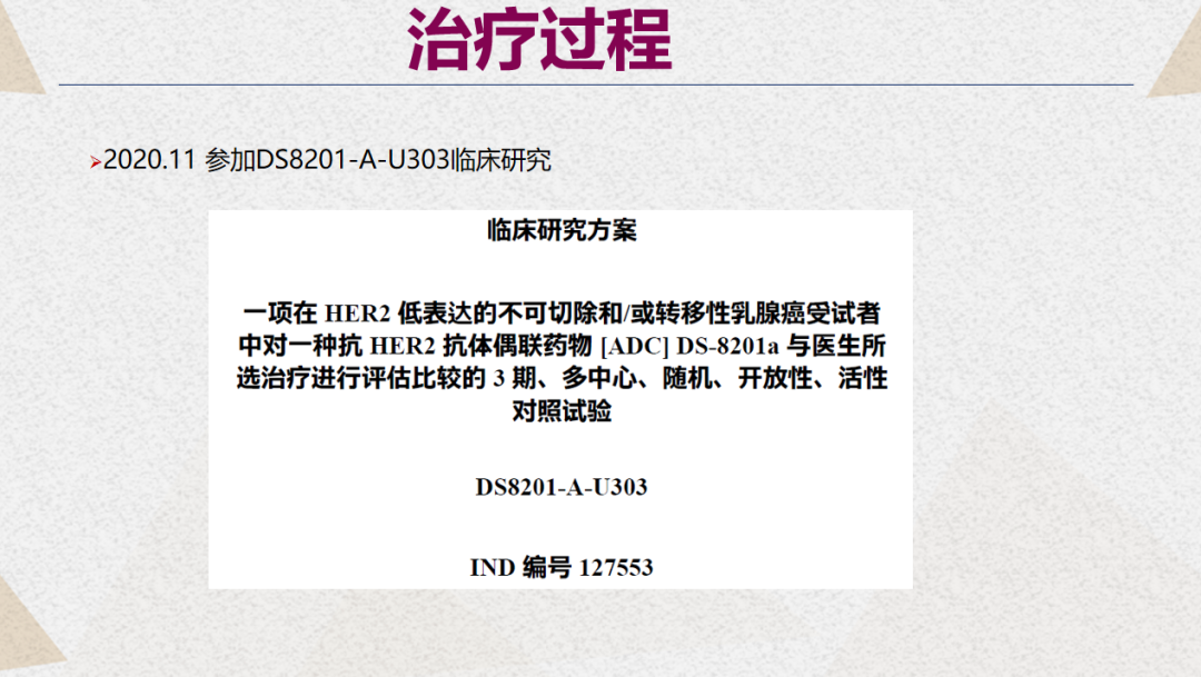 杨谨教授:在既往前三线治疗中,患者的PFS均较短,由于患者入组DS8201-A-U303临床研究,其在晚期四线治疗中实现了14个月的PFS获益,这是较为成功的案例。对于临床研究外的HER2低表达人群,如果DS-8201治疗有效,我们应如何管理这类病人,请李慧慧教授分享下治疗经验。