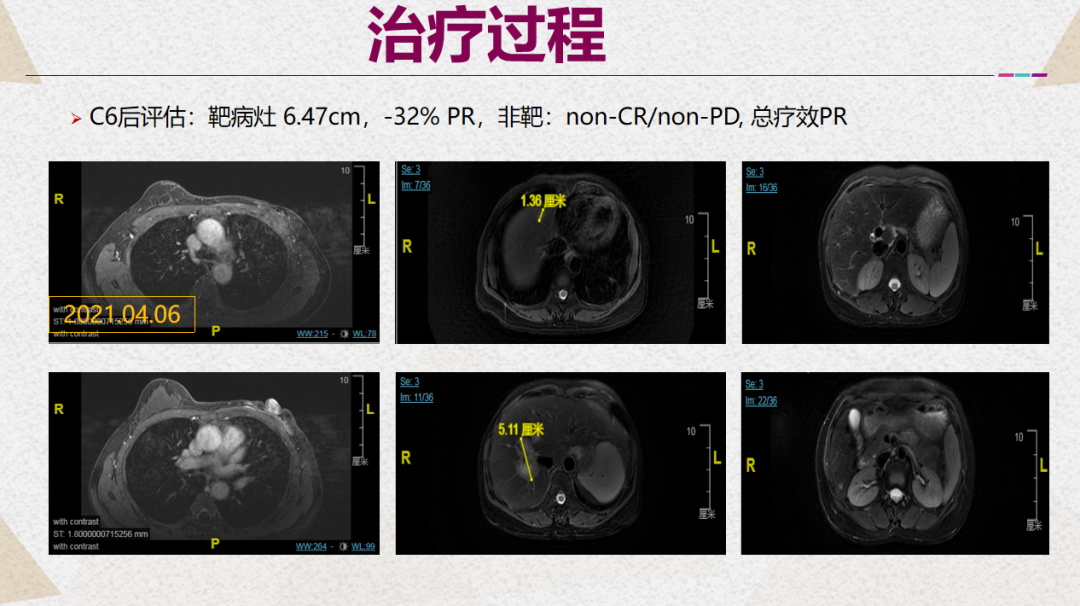 杨谨教授:该病例中患者为初诊Ⅳ期的乳腺癌且出现孤立性肝转移,在CDK4/6抑制剂出现进展后接受化疗,后检测为HER2低表达。我们假设将有效的治疗药物(DS-8201)前移,患者从治疗开始就有良好的缩瘤效果,然后采用多学科的综合治疗,从而实现更好的病情控制。如果让您进行选择,您会如何进行决策?