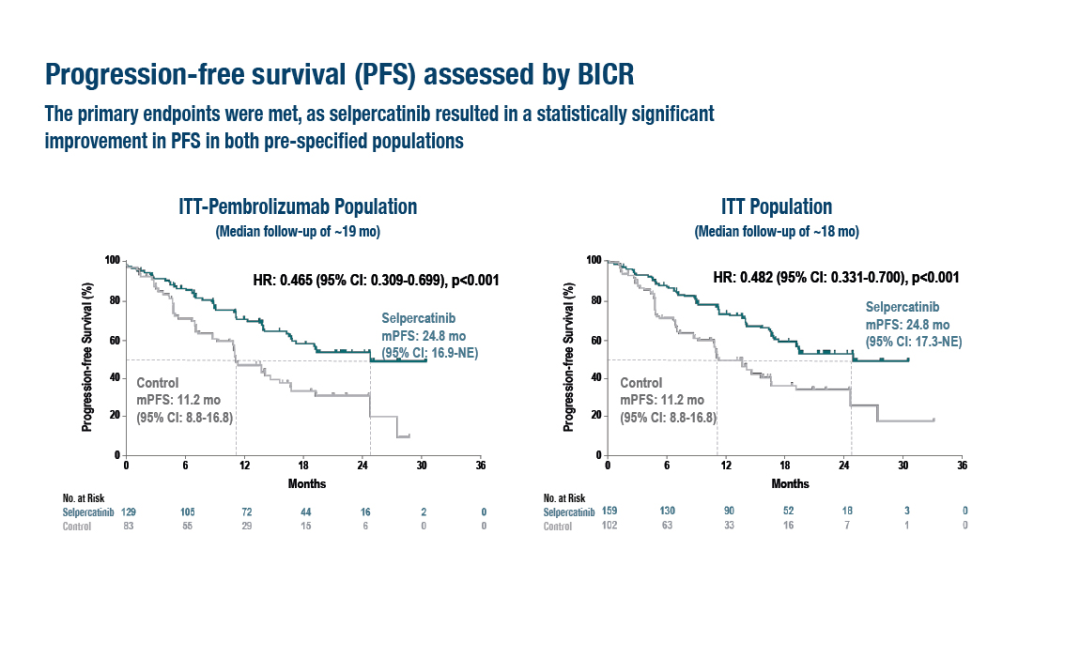 中位随访时间约为19个月。与接受化疗+帕博利珠单抗的ITT-pembro人群相比,接受塞普替尼治疗患者的PFS获益更多,分别为24.8和11.2个月(HR=0.465,95%CI: 0.309~0.699,p<0.001);在ITT人群中,接受塞普替尼治疗的患者的PFS也优于对照组(HR=0.482;95% CI: 0.331–0.700;p<0.001)。