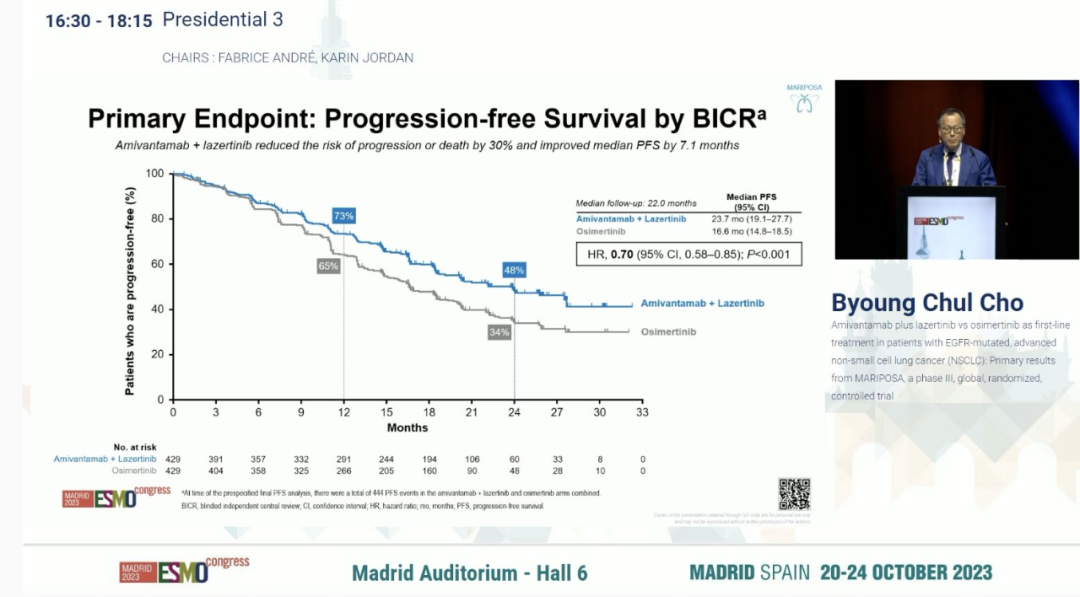 在MARIPOSA试验中,与接受奥希替尼单药治疗的429例患者相比,接受Amivantamab联合不可逆第三代EGFR-TKI拉泽替尼治疗的429例患者的疾病进展或死亡风险降低了30%(风险比[HR]=0.70;95%可信区间[CI]: 0.58~0.85;p<0.001),中位无进展生存期(PFS)分别为23.7个月(95% CI: 19.1-27.7)和16.6个月(95% CI: 14.8-18.5),中位随访时间为22.0个月。