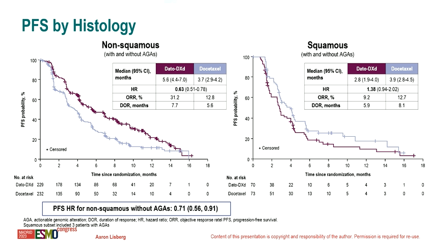 在预设的亚组分析中,在非鳞状NSCLC患者中,Dato-DXd相对于多西他赛的PFS和OS的HR数值特别低(在非鳞状和鳞癌患者中,Dato-DXd相对于多西他赛的PFS HR分别为0.63 vs. 1.38;OS HR分别为0.77 vs. 1.32)。非鳞状组织学类型的患者在 Dato-DXd 治疗组 (n=229) 的中位 PFS 为 5.6 个月,而多西他赛组为 3.7 个月(HR=0.63;95% CI: 0.51-0.78),ORR 分别为 31.2% 和 12.8%,DOR 分别为 7.7 个月和 5.6 个月。