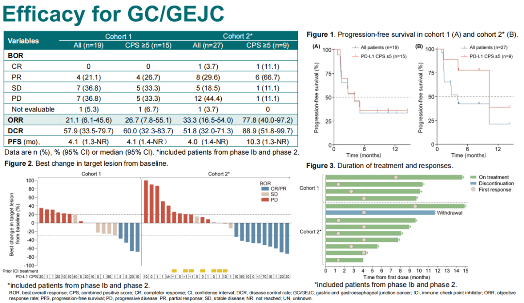肿瘤瞭望:请您介绍一下此项研究的研究结果,包括有效性及安全性数据,以及为什么在队列2中PD-L1 CPS≥5的胃/胃食管结合部癌患者中取得了明显优于其他患者的中位PFS?