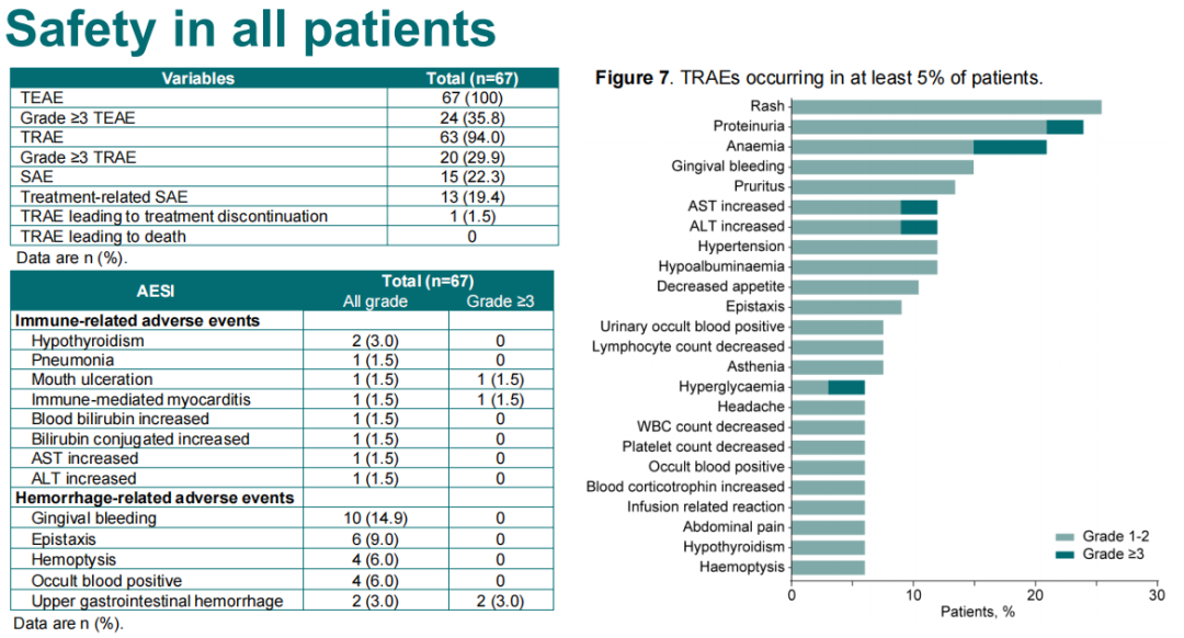 骆卉妍教授:首先给大家介绍一下研究结果,Ⅰb期研究主要是探索药物安全性和确定最佳剂量,共入组14例患者,安全性良好,未观察到DLT(Dose-limiting toxicity,剂量限制性毒性),最后确定的Ⅱ期推荐剂量为贝伐珠单抗15 mg/kg,SHR-1701 30 mg/kg,三周一次。