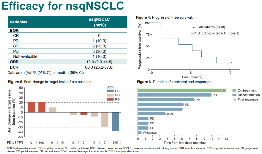 骆卉妍教授:Ⅱ期研究入组的非鳞非小细胞肺癌患者共10例,均为铂类化疗、免疫治疗失败的患者,其中1例患者达到部分缓解(PR),并且疾病控制时间超过12个月,提示免疫治疗耐药患者也有可能从SHR-1701联合贝伐珠单抗治疗中获益。我们需要进一步探索SHR-1701联合贝伐珠单抗作为免疫跨线治疗的获益人群。