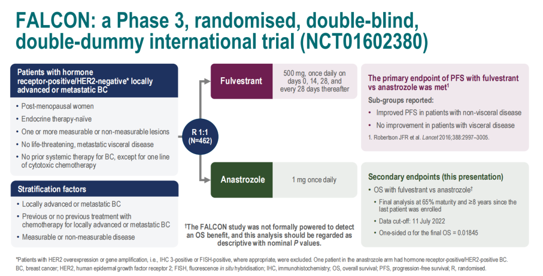 ESMO 2023丨氟维司群vs阿那曲唑在内分泌初治的HR阳性晚期乳腺癌患者人群(FALCON研究)中的最终总生存分析结果公布