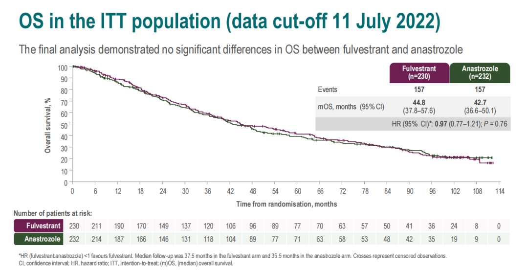 截止日期为2022年7月11日,总体人群(462名患者)中位总生存数据的成熟度为68%(氟维司群组157例,阿那曲唑组157例),氟维司群组患者的中位OS为44.8个月,而阿那曲唑组的中位OS为42.7个月(HR 0.97,[95%CI:0.77~1.21];P=0.76)。预先指定的亚组中位OS与总体人群一致。