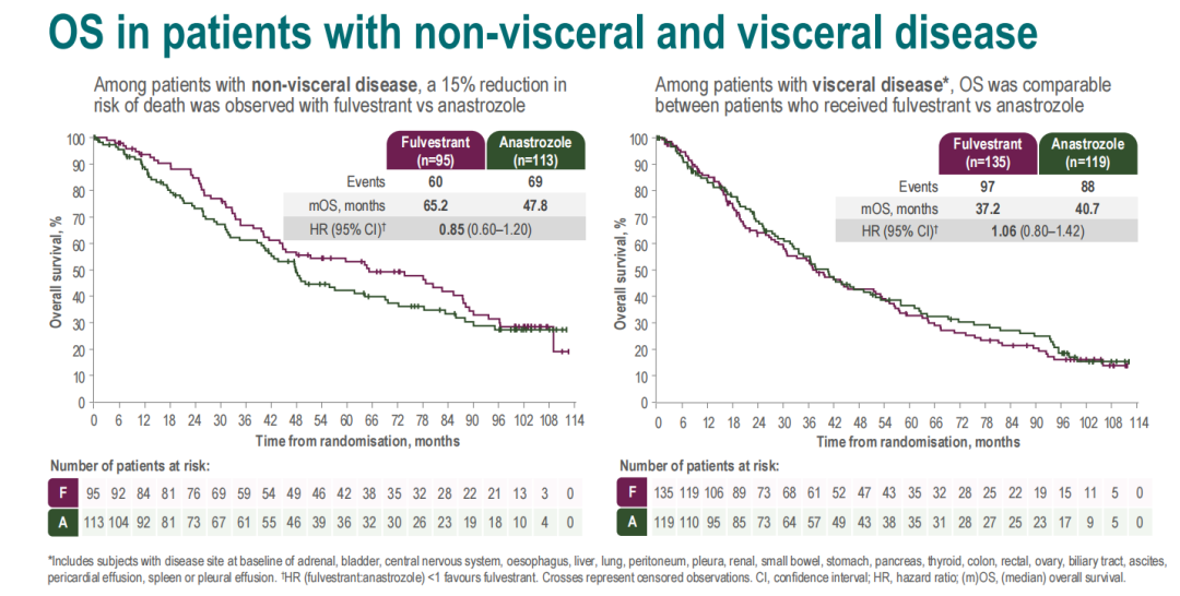 在非内脏转移的患者中,氟维司群组与阿那曲唑组相比,死亡风险降低了15%,但二者未达到统计学差异。在有内脏转移的患者中,接受氟维司群和阿那曲唑治疗患者的OS相当。两组患者在生活质量方面没有看到明显的差异。没有出现新的安全信号。