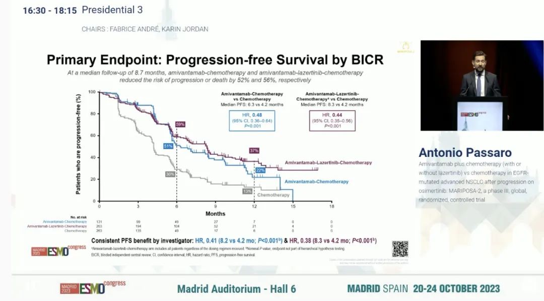 编者按:2023年ESMO会议发布了备受国际关注的MARIPOSA、MARIPOSA-2研究(摘要号LBA14&LBA15),展示了Amivantamab联合方案在EGFR突变阳性非小细胞肺癌(NSCLC)一线治疗和耐药后治疗中的探索结果。MARIPOSA-2试验研究者、意大利米兰IRCCS欧洲肿瘤研究所Antonio Passaro在《肿瘤瞭望》现场访谈中对这两项结果予以点评。