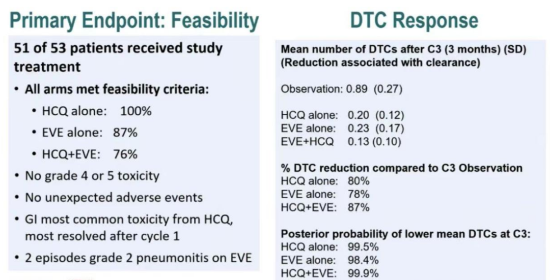 研究结果:本研究共入组197名乳腺癌患者,184名患者进行了初始骨髓穿刺,其中55名(30%)患者为DTC+。53名DTC+患者被随机分配到3组,分别接受HCQ(n=15)、EVE(n=15)、HCQ+EVE(n=23)治疗,其中13名患者在3个月观察期后接受HCQ+EVE治疗。在51名接受治疗的患者中,3种治疗方案均达到可行性的主要研究终点(HCQ组:100%;EVE组:87%;HCQ+EVE组:76%)。