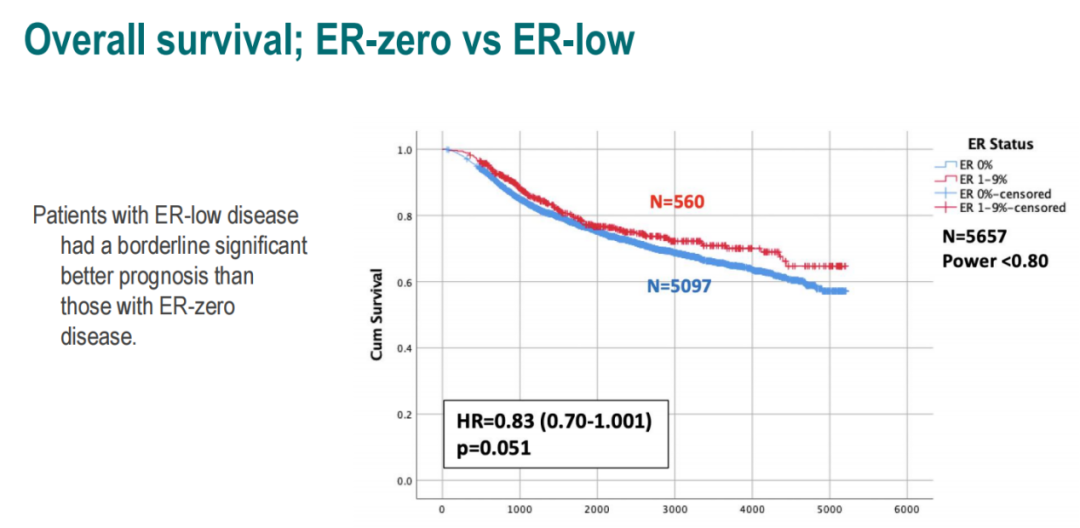 在整个队列中5.7%的ER低表达患者接受了内分泌治疗,而ER阴性比例达到了3.3%。