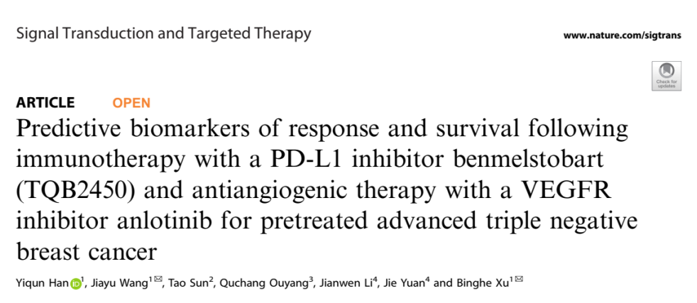 Han,Y.,Wang,J.,Sun,T.et al.Predictive biomarkers of response and survival following immunotherapy with a PD-L1 inhibitor benmelstobart(TQB2450)and antiangiogenic therapy with a VEGFR inhibitor anlotinib for pretreated advanced triple negative breast cancer.Sig Transduct Target Ther 8,429(2023).
