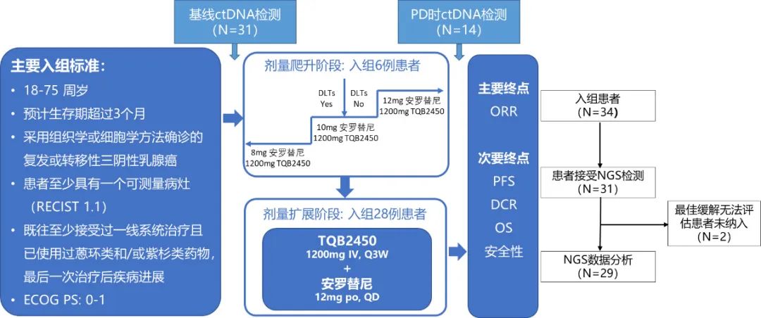 三阴性乳腺癌(TNBC)是一种侵袭性亚型乳腺癌,其预后较差,中位总生存期(OS)为12-18个月。细胞毒性化疗仍然是标准治疗方式,但其疗效欠佳,接受一线化疗的患者往往会出现进展、复发或转移。一线治疗失败后的TNBC患者治疗选择相对有限,标准化疗的反应率低(10%-15%),中位无进展生存期(PFS)仅为2-3个月,亟需为这些患者寻找新的治疗选择的需求。安罗替尼是一种多靶点小分子酪氨酸激酶抑制剂(TKI),可有效抑制肿瘤血管生成。贝莫苏拜单抗(TQB2450)是一种靶向PD-L1的人源化单克隆抗体。在Ib期试验(ClinicalTrials.gov Identifier:NCT03855358)安罗替尼联合贝莫苏拜单抗在经治的三阴性乳腺癌患者中,展示了有希望的抗肿瘤活性,ORR为26.5%,安全性可控(