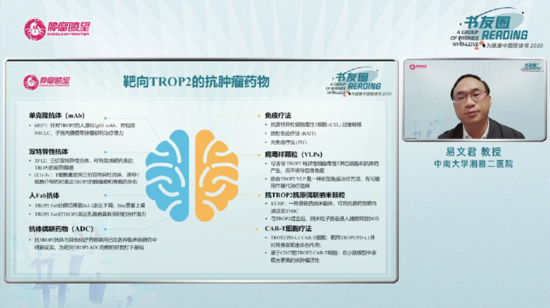 编者按:2023年11月8日19:30,西安交通大学第一医院杨谨教授(主持)与天津医科大学肿瘤医院贾勇圣教授(讲者)、中南大学湘雅二院易文君教授(讲者)共同做客《书友圈》,探讨Trop-2 ADC作用机制及临床应用的相关问题。