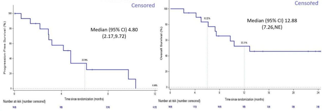 陈忠平教授:我在2023年欧洲神经肿瘤协会(EANO)大会上对该研究结果进行了展示。到目前为止,我们共成功入组了21例患者,纳入疗效评价的患者为19例。其中15例为胶质母细胞瘤(GBM),4例为3级胶质瘤。中位随访时间为22.37个月,患者的中位PFS为4.80个月(95%CI:2.17~9.72),中位OS为12.88个月(95%CI:7.26~NE),6个月PFS率为33.70%,6个月OS率为83.22%,12个月OS率为52.31%。