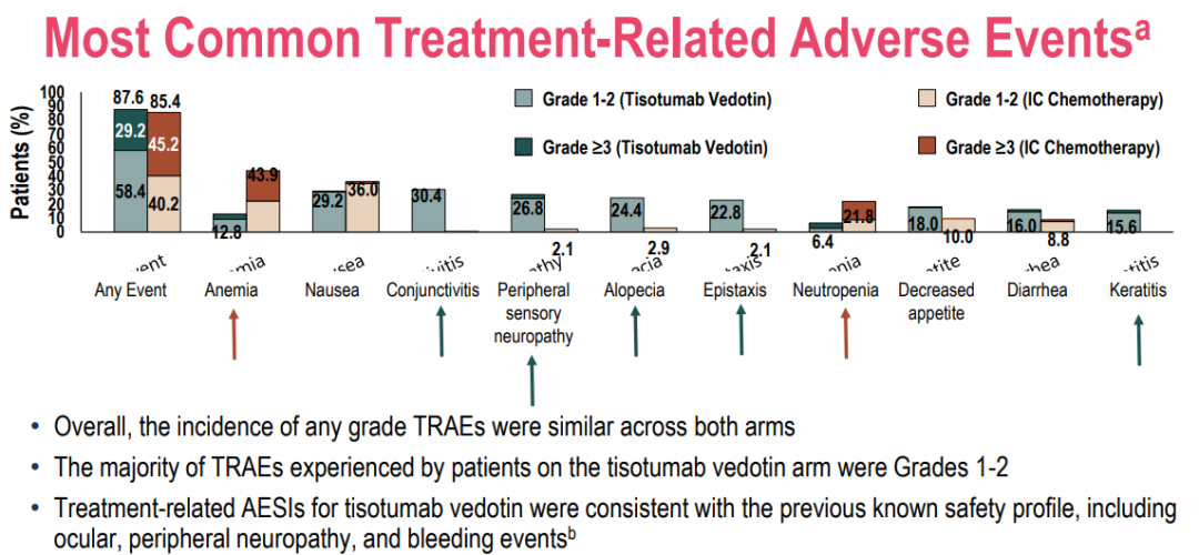 大多数患者至少发生1次治疗相关不良事件(TV组:87.6%[≥3级:29.2%],化疗组:85.4%[≥3级:45.2%]),TV组大多数治疗相关不良反应是1-2级。不良反应与TV已知的安全性数据一致,包括眼部毒性、周围神经病变和出血不良反应。