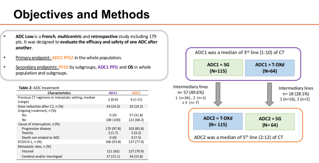 研究方法:我们对19个法国综合癌症中心进行了回顾性研究。所有HR+或HR-/HER2-low MBC患者均接受SG治疗,随后立即接受T-DXd(或反之亦然)。HR表达是在最后可用的肿瘤样本上定义的。该研究的主要目标是报告整个人群的第二个ADC(ADC2)无进展生存期(PFS)。次要目标包括整个人群中的首次ADC(ADC1)无进展间期(PFI)和总生存期(OS)以及按HR状态进行的亚组分析。