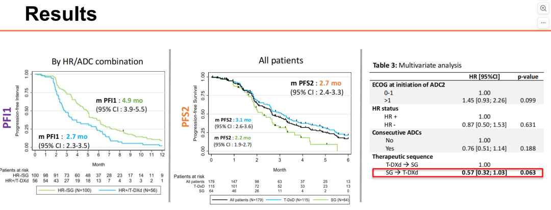 中位随访3个月后,63例患者停用ADC2,其中51例(82.3%)因疾病进展,4例(6.5%)因T-DXd引起的毒性。重要的是,在第一次分析时,50%的患者(N=63)仍处于ADC2状态。观察到的ADC2中位PFS和ADC1中位PFI如下所示: