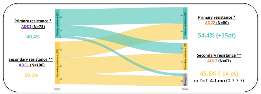 结论:据我们所知,这是评估HER2-low MBC患者后续服用ADC疗效的最大队列研究。在这些大量预处理的患者中,随后使用ADC似乎与HR+/HR-亚组的PFS缩短有关,而与给药顺序无关。ADC1后ADC2暴露与原发性耐药患者增加相关(ADC1和ADC2分别为40.4%和54.4%),其中50%的患者对ADC1有继发性耐药。ADC2对39%原发性ADC1耐药的患者短期有效。需要进一步的研究来了解耐药机制。