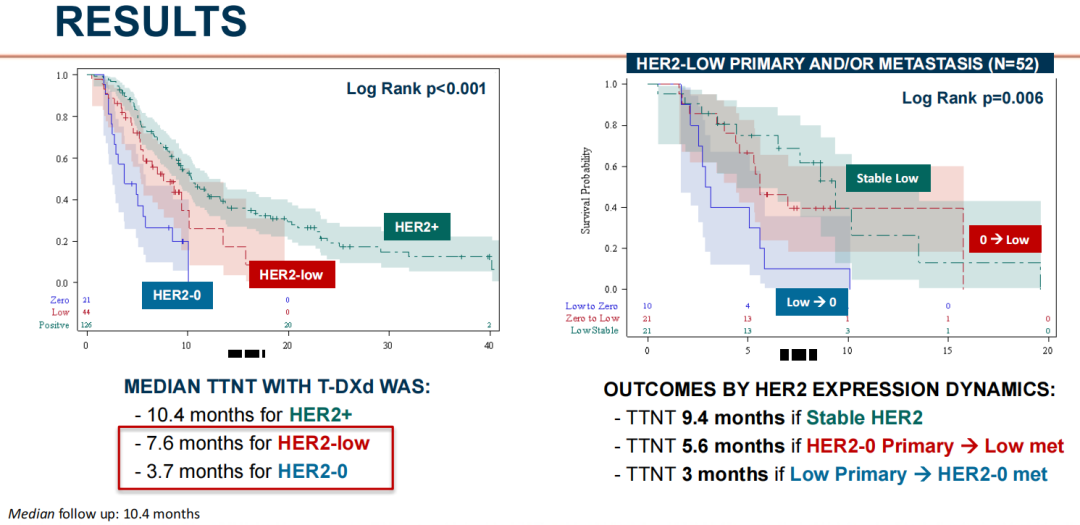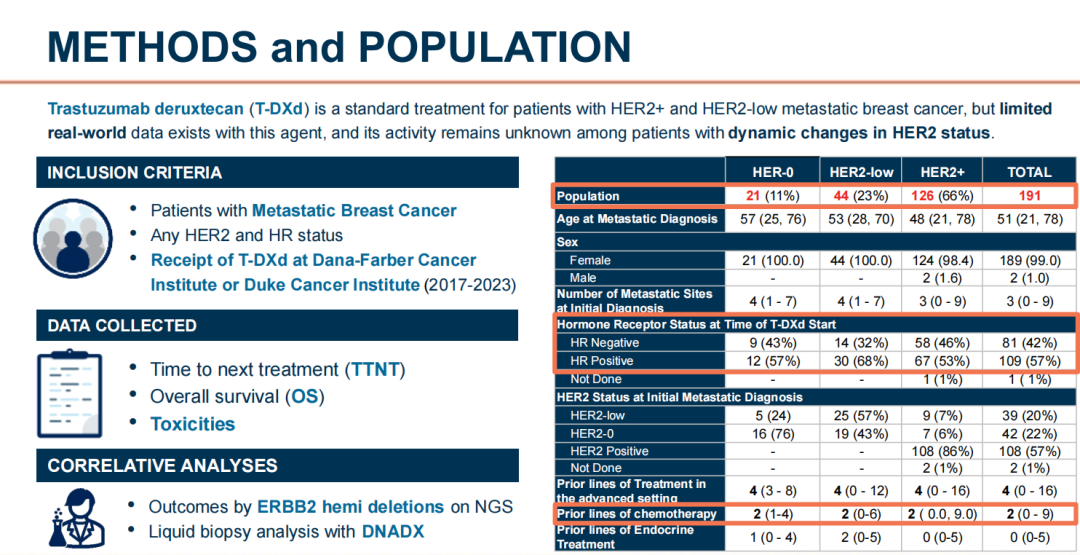 研究背景:T-DXd是HER2阳性(HER2+)和HER2低表达转移性乳腺癌(MBC)患者(pts)的标准治疗方法。HER2低表达已被证明是一种高度不稳定的生物标志物,并且没有关于HER2状态随时间变化的患者中T-DXd活性的数据。此外,关于T-DXd进展后给药方案的性能数据有限。
