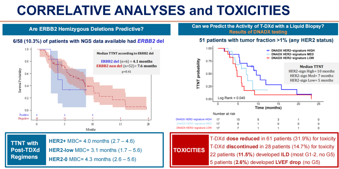 最后一次随访,55例患者仍在使用T-DXd(28.8%),108例进展(56.5%),28例因毒性停药(14.7%)。共有22例(11.5%)发生间质性肺疾病(ILD,G1级:6.2%,G2级:3.1%,G3级:1.6%,G4级:0.5%,无G5)。从T-DXd开始发生ILD的中位时间为8个月,63.6%的病例得到缓解,缓解的中位时间为4个月(1级事件为2个月)。5例患者(2.6%)出现心脏毒性。61例患者(31.9%)减少了T-DXd的剂量,最常见的是疲劳(14.7%)、恶心/呕吐(9.9%)或血液毒性(6.3%)。105例接受T-DXd后治疗的患者中,HER2+的TTNT为4个月,HER2-low的TTNT为3.1个月,HER2-0的TTNT为4.3个月(P=0.62)。HER2阴性肿瘤和ERBB2半合子缺失患者(6/58,10.3%)的TTNT为4.1个月,而没有ERBB2缺失的患者为7.6个月(P=0.41)。