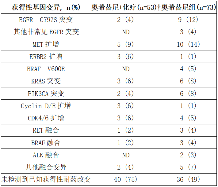针对138个基线和疾病进展时的匹配血浆样本进行分析的结果提示,奥希替尼+化疗组(n=53)和奥希替尼单药治疗组(n=73)的耐药机制大致相似(表),尽管在奥希替尼+化疗组中检测到的获得性EGFR C797S和MET扩增的患者数量少于奥希替尼单药组(其中EGFR C797S突变分别有2例vs 9例,MET扩增分别有5例vs10例)。