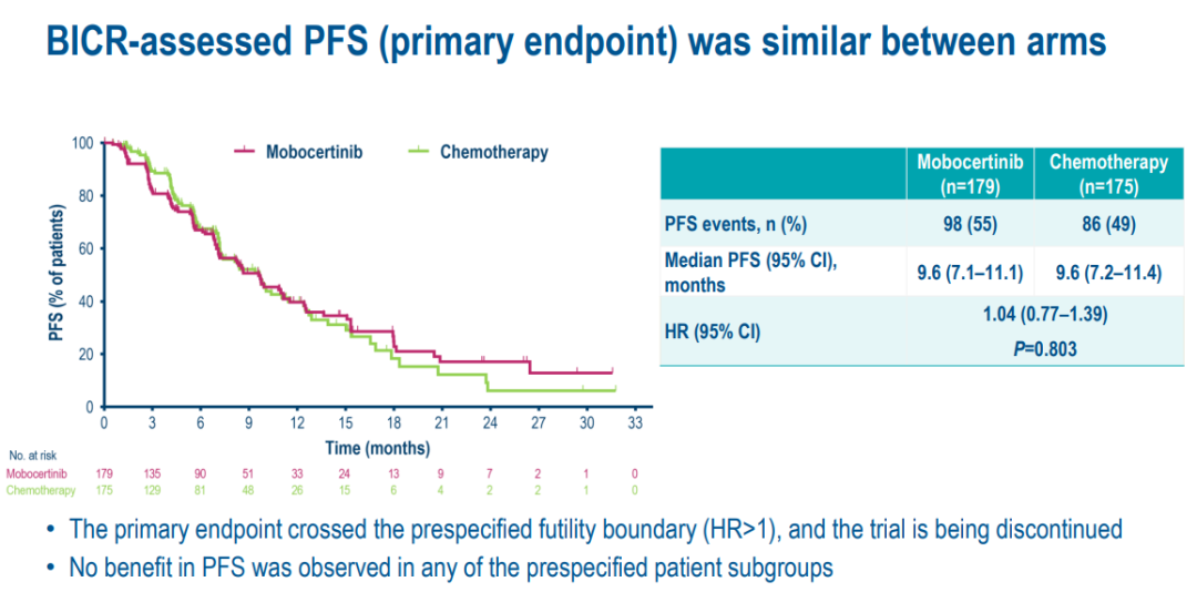 III期EXCLAIM-2研究比较了莫博赛替尼(mobocertinib)与铂类为基础化疗的一线治疗EGFR外显子20插入(ex20ins)突变局部晚期/转移性非小细胞肺癌(NSCLC)的疗效和安全性。EXCLAIM-2未达到无进展生存期(PFS)主要终点,莫博赛替尼的PFS曲线与化疗完全重叠,提示莫博赛替尼的治疗活性与化疗非常相似,在任何预先设定的患者亚组中均未观察到PFS获益。遗憾的是,本试验的设计目的是寻找优效性,因此我们只能说EXCLAIM-2没有证明莫博赛替尼的优效性。ALINA亚洲亚组分析与全球ALINA数据一致。