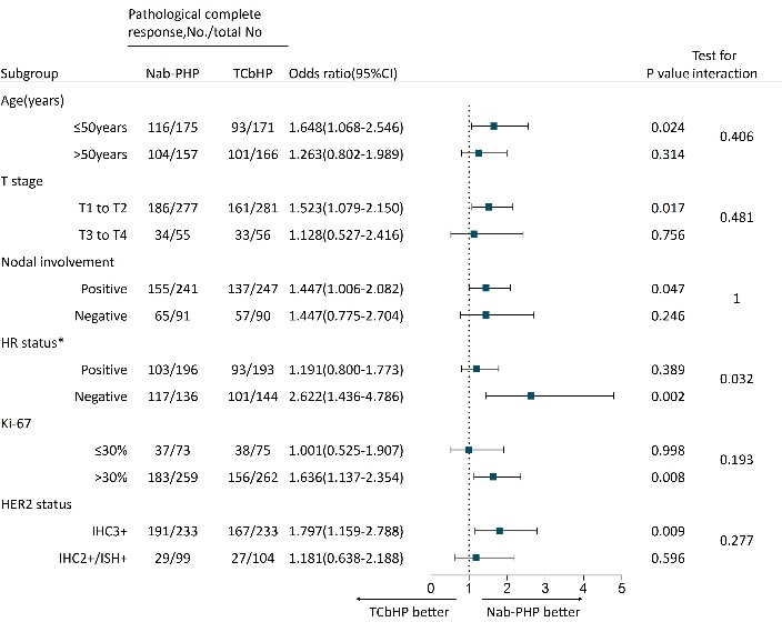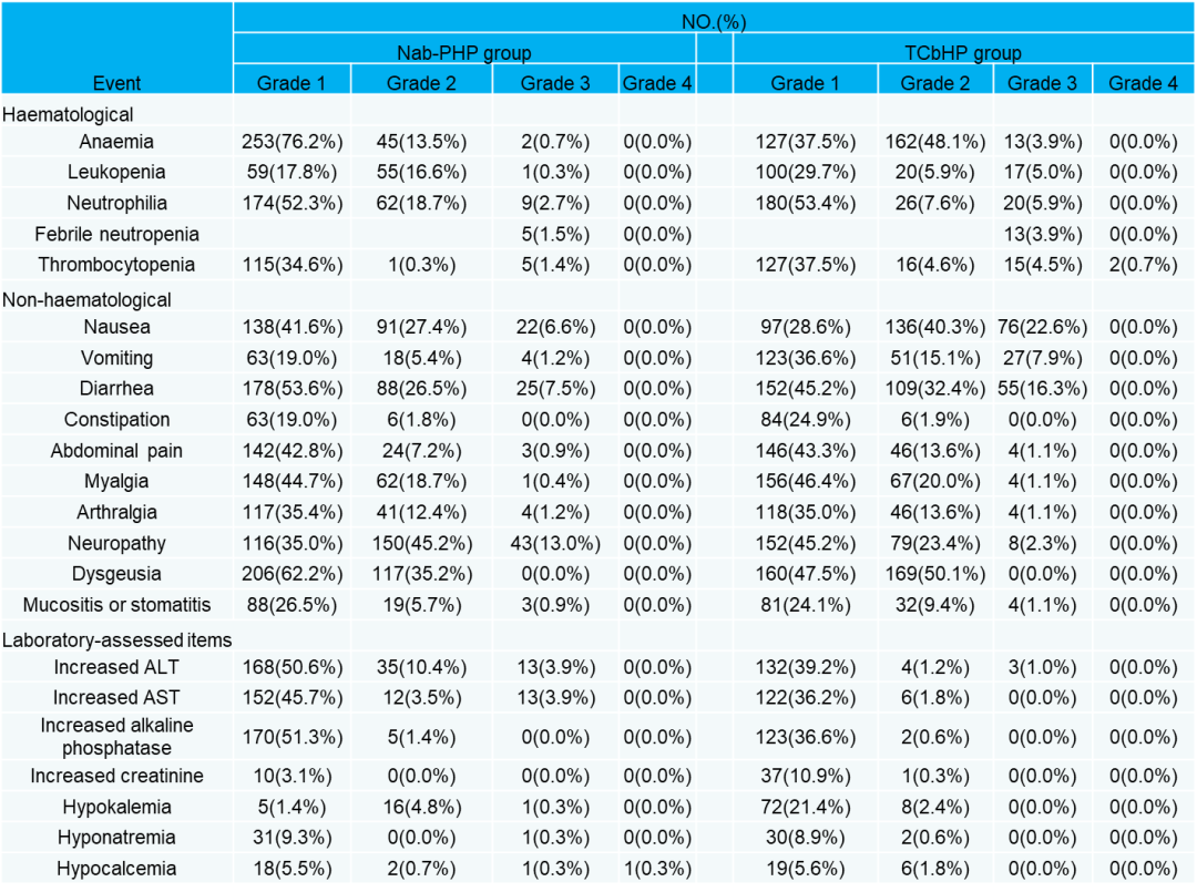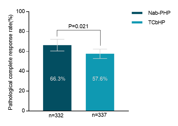 2020年9月至2023年3月,我们随机分配了689名女性,其中669名开始治疗(332名接受nab-PHP,337名接TCbHP)。与TCbHP组相比,nab-PHP组有更高的pCR患者比例(220例[66.3%,95%CI:61.2%~71.4%]);TCbHP组为194例[57.6%,95%CI:52.3%-62.9%]。pCR的OR为1.448(95%CI:1.058-1.981),P=0.021。整个入组人群中,34.1%(228名)的患者至少出现了一次3级或4级AE事件,nab-PHP组为30.1%(100名),TCbHP组为38.0%(128名),P=0.032。最常见的3级或4级事件是恶心(669名患者中14.6%)、腹泻(12.0%)和神经病变(7.6%)。无治疗相关死亡。