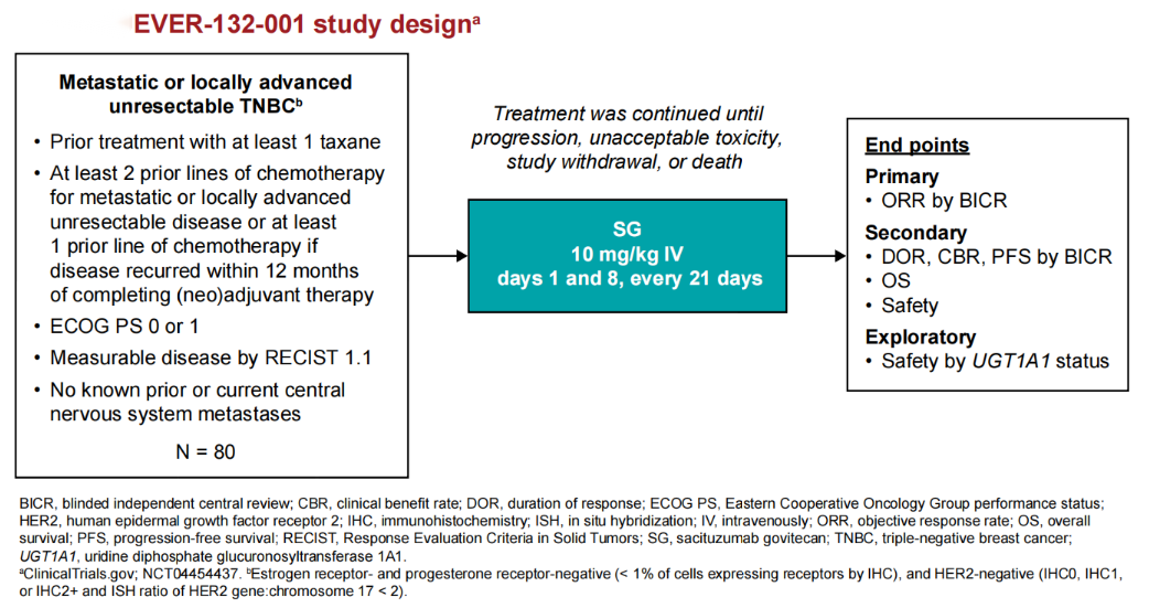 肿瘤瞭望:Ⅲ期ASCENT研究证实SG在晚期三阴性乳腺癌(mTNBC)领域的PFS和OS生存获益;Ⅱ期EVER-132-001研究则是SG治疗中国mTNBC患者的桥接研究,以往已经报道PFS数据,并因此获得国内相关适应症批准。本次SABCS大会报道了EVER-132-001研究的OS结果。请王殊教授简单回顾一下EVER-132-001研究的既往数据。