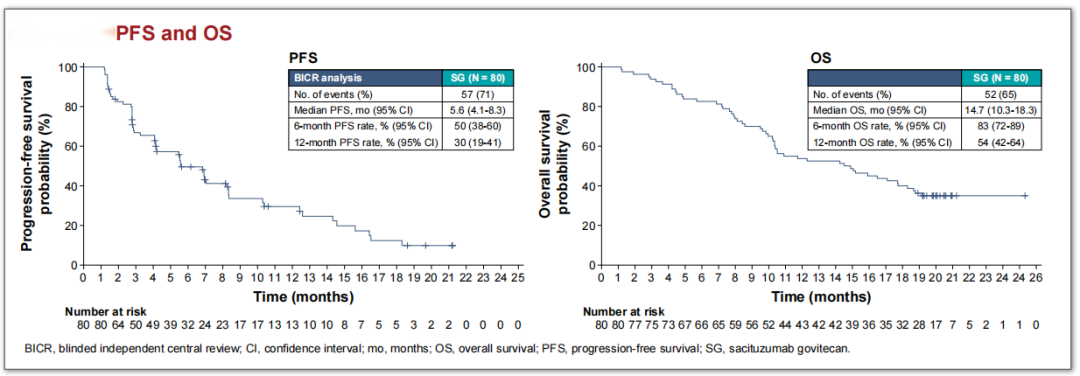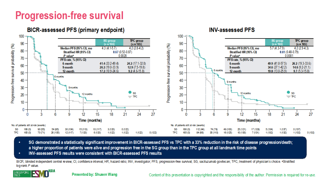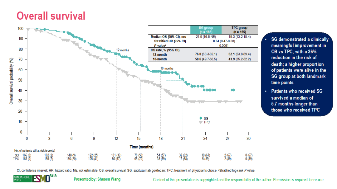 EVER-132-002研究显示,SG组较TPC组可显著改善PFS(BICR评估中位PFS:4.3 vs 4.2个月,HR=0.67,P=0.0028),虽然绝对数值差异不大,但其Stratified HR为0.67,P值具有统计学意义,且PFS曲线有显著差异。此外,SG组的中位OS较TPC组长(21.0个月vs 15.3个月,HR=0.64,P=0.0061),SG组和TPC组的ORR分别为20%和15%。因此,从亚洲的桥接研究EVER-132-002的结果可见,其总体疗效与全球的Ⅲ期临床研究TROPiCS-02相似。