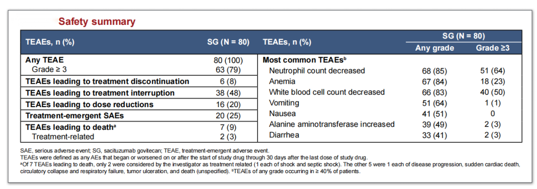 从安全性来看,EVER-132-002研究的结果与既往报道一致,最常见的≥3级TEAE是中性粒细胞减少症(SG组为69%,TPC组为62%),进一步证实了SG可用于HR+/HER2-mBC患者的治疗。