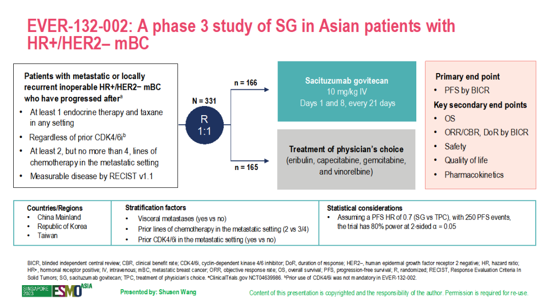 陈益定教授:Ⅲ期TROPiCS-02研究已证实,SG在经治的HR+/HER2-mBC患者中,可显著改善PFS(5.5 vs 4.0个月,HR=0.66)和OS(14.4 vs 11.2个月,HR=0.79)。基于此,SG已经于2023年2月被批准用于既往内分泌治疗耐药且接受过≥2线系统治疗(针对转移性疾病)的HR+/HER2-mBC患者。EVER-132-002研究入组患者主要来自中国大陆、中国台湾和韩国等地区,入组标准大致与TROPiCS-02研究相似,患者既往接受过2-4线化疗,但EVER-132-002研究中患者不强调是否接受过CDK4/6i治疗,而TROPiCS-02研究中患者均接受过CDK4/6i治疗。
